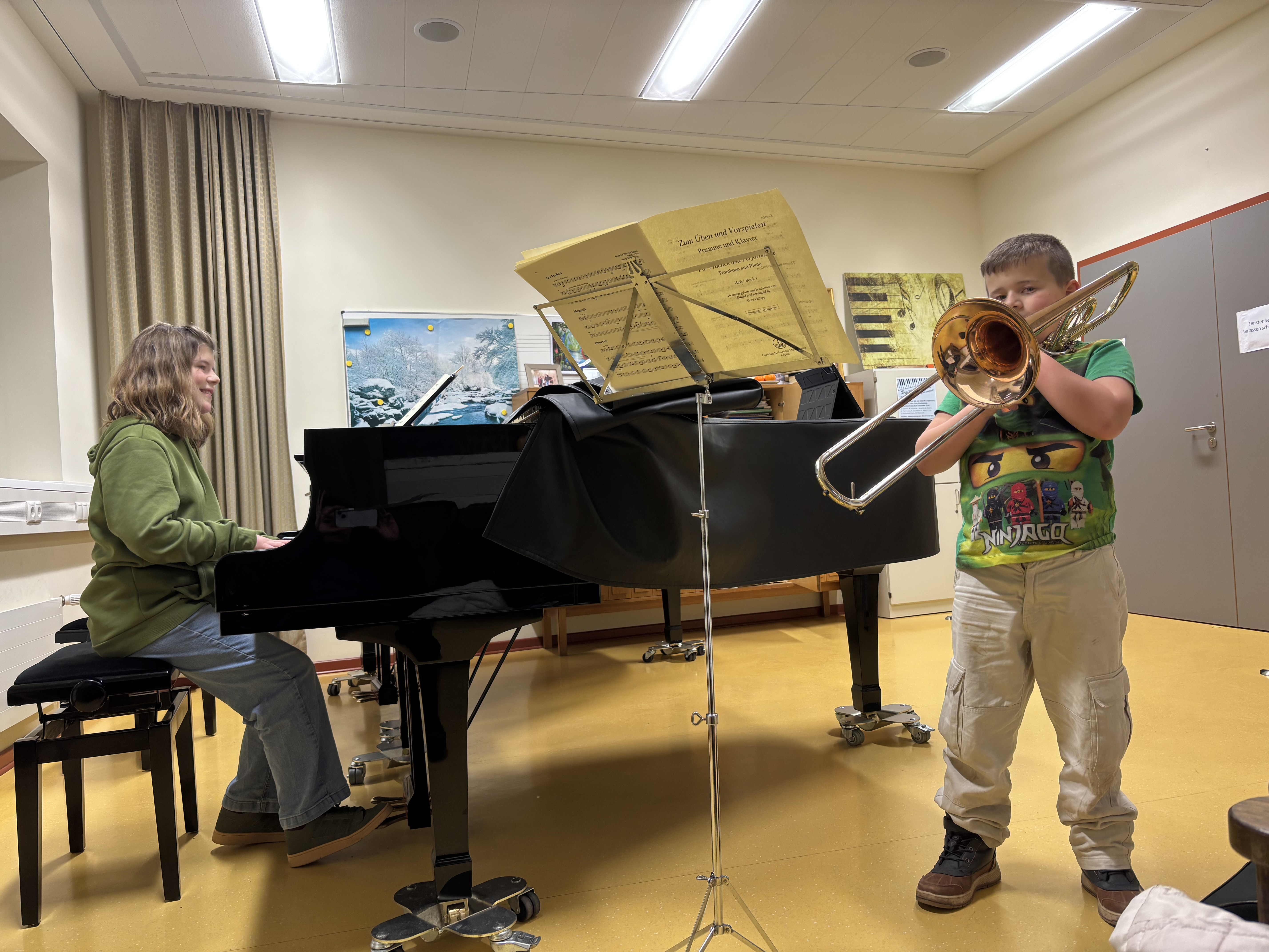 - Klavier: Ein beliebtes Instrument, das in vielen Musikstilen von Klassik bis Pop eingesetzt wird. Du kannst klassische Stücke von Bach oder Beethoven lernen oder moderne Pop-Hits wie „Shape of You“ von Ed Sheeran spielen.